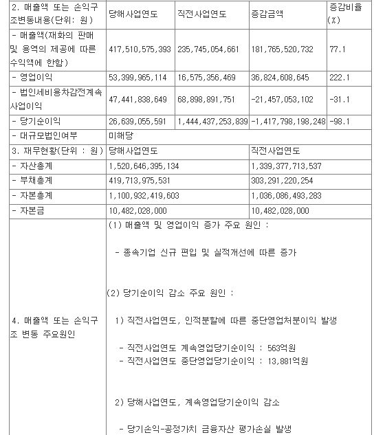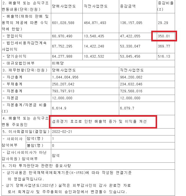 섬유경기 호조로 인한 매출액 증가 및 이익률 개선이라고