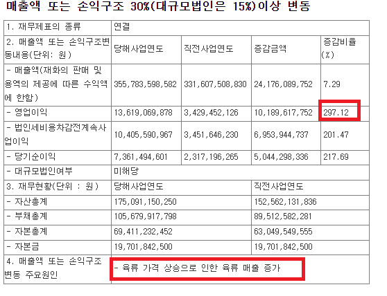 육류 가격 상승으로 인한 육류 매출 증가로 공시하였으며,